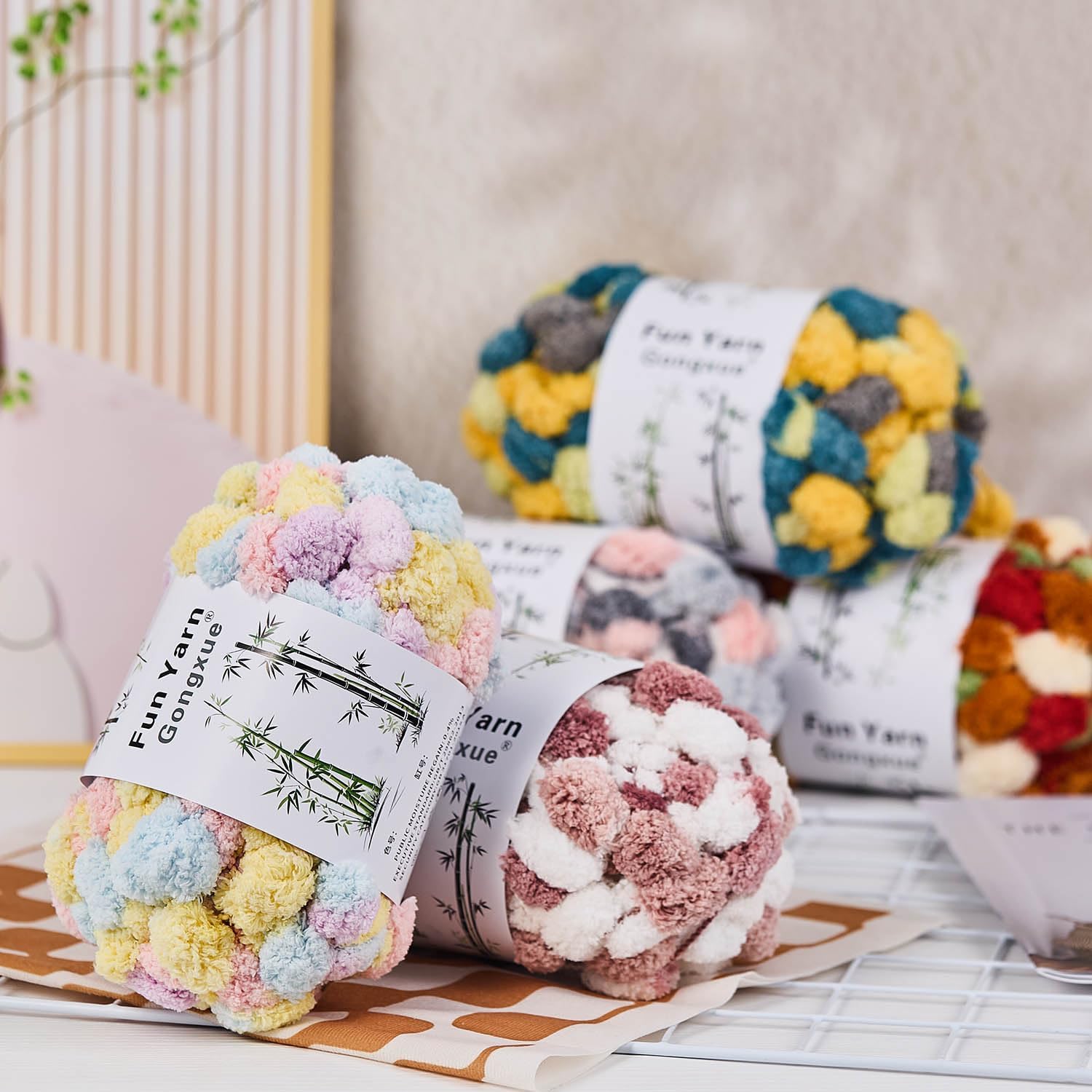 Our Fun pom pom yarn made with extra-large poms! it is a new style yarn in market, very popular. watch the pom poms fall into neat rows as you stitch. Great for mat,scarves, rugs, wall hangings and home decor projects. Great for wrapping letters or a wreath form or just hang it for a colorful garland. Easy to work with, this fun yarn will be your new favorite. Available in both solids and prints, many colors for your choose, the possibilities are endless.