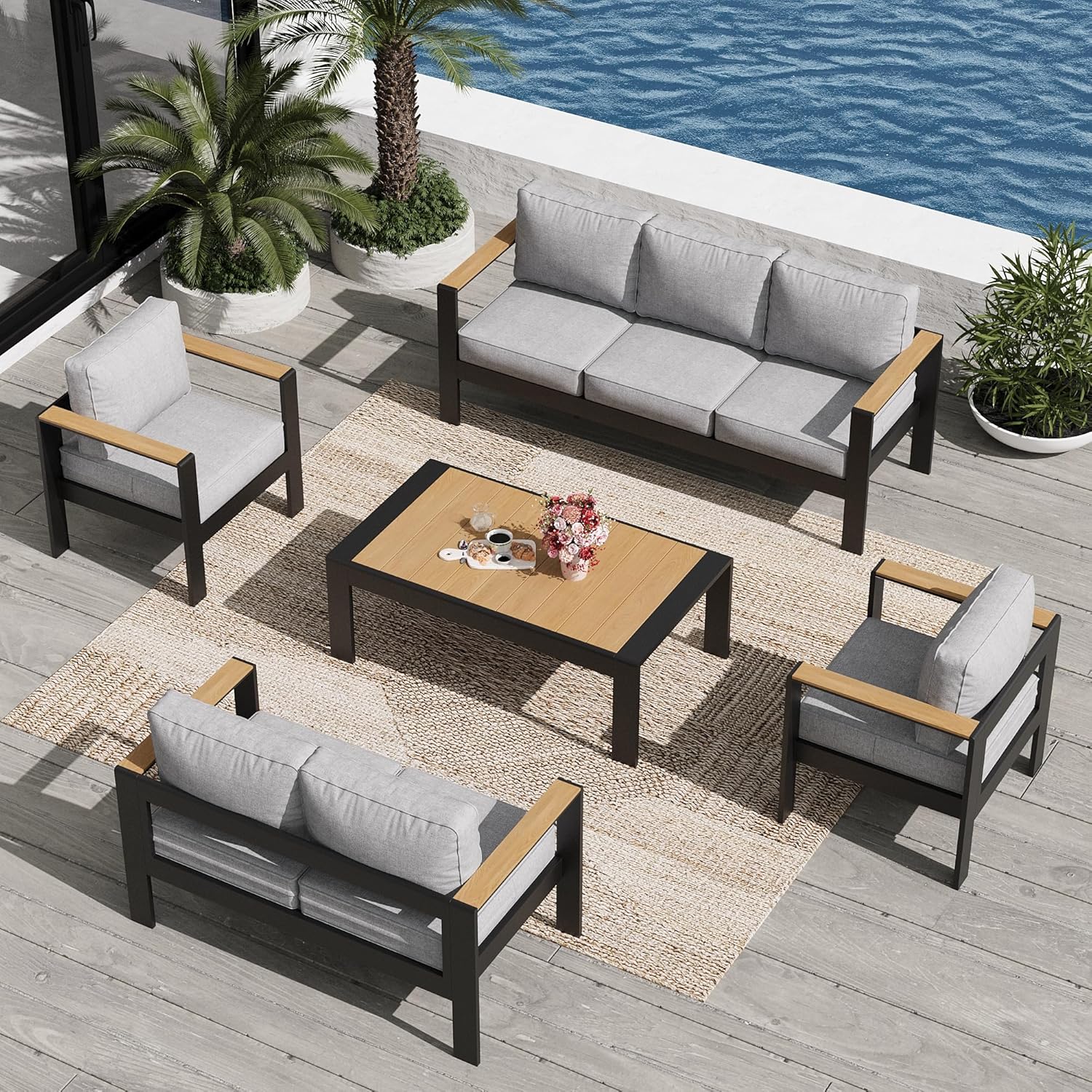 The Aeeiua outdoor furniture set combines comfort, durability and a sense of style. Clean lines and wide armrests are designed for a simple yet stylish look that elevates any outdoor space. Crafted lightweight, pow-coated aluminum with elegant wood grain is embedded on each armrest, and the cushion covers are made of 100% olefin fabric for comfort and durability. Prop an iced drink on Chair's wide arms and sink back into its deep-seated and softly cushioned comfort. Why will become your ideal choice?Our furniture frames are made of powder-coated aluminum metal for unmatched robustness and stability.Powerful & solid frames can hold up to 400 pounds for seating, ensuring you are safe to use.High-quality olefin fabric has UV resistance can withstand 2,000 hours of intense sunlight exposure.Zipper design allows easy removal & washing, ensuring your furniture always looks and feels its best.A variety of placement combinations are perfect for chatting space or creating a cozy corner.Furniture set comes with clear instructions and necessary tools for quick & straightforward assembly.