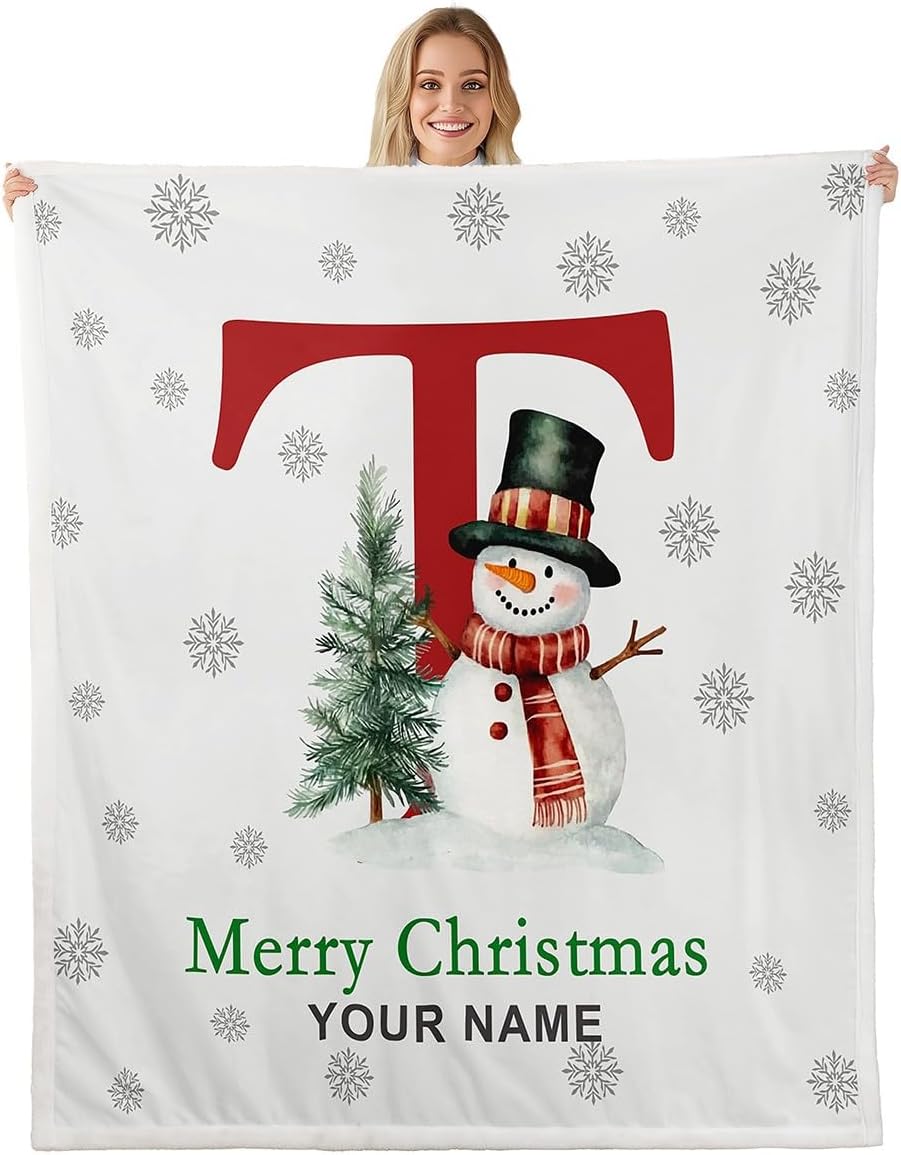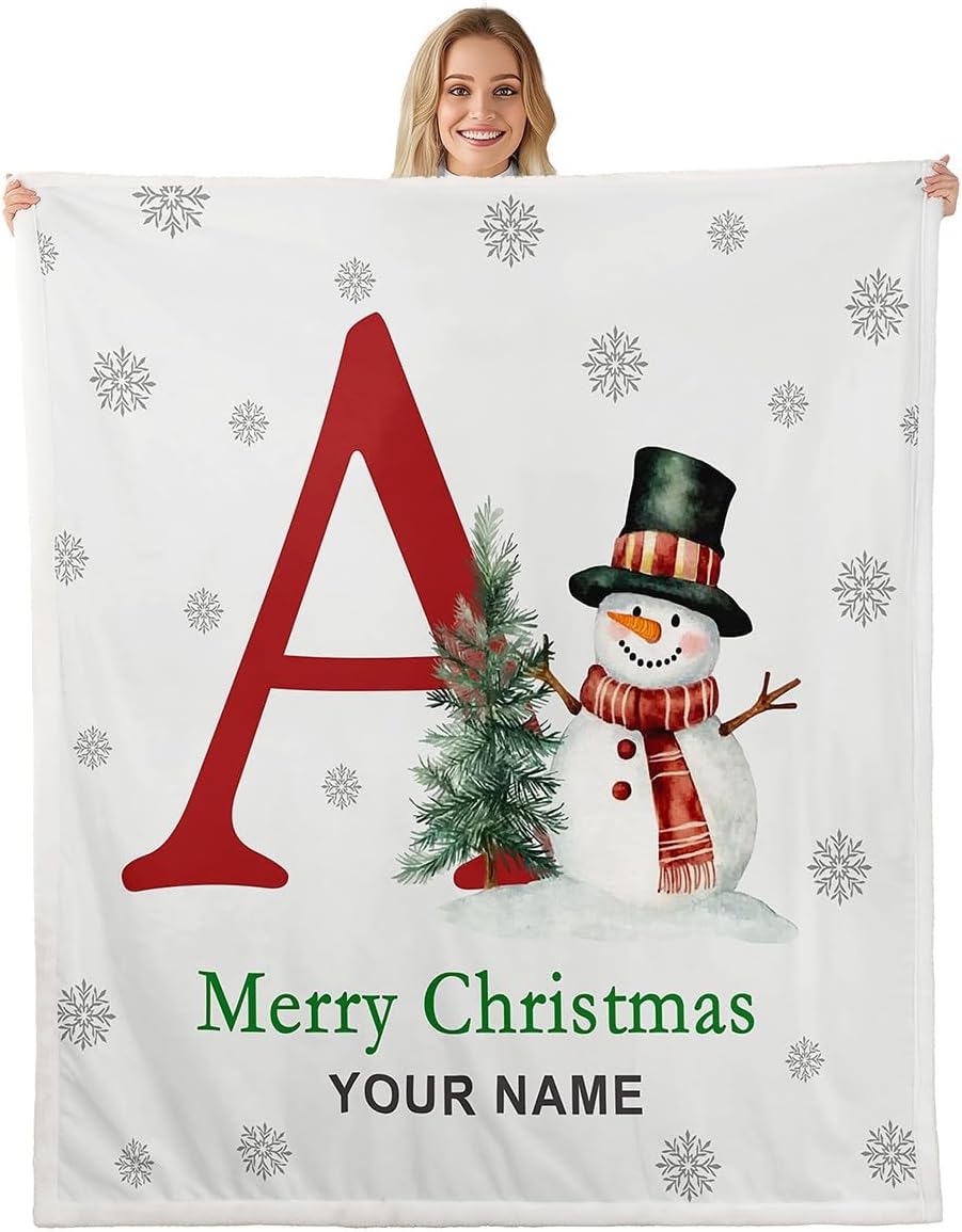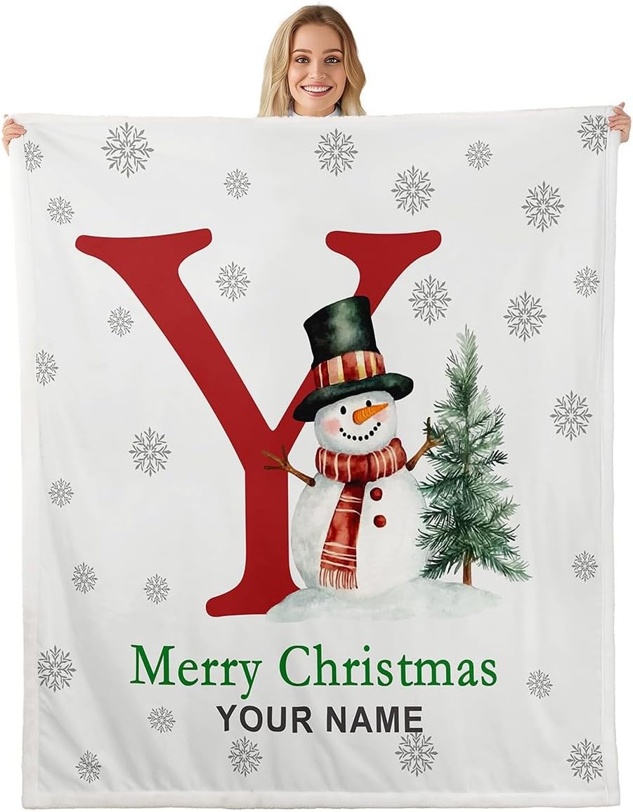 Erosebridal Merry Christmas Custom Name Fleece Blanket Twin 60x80 | Personalized Snowman Initial O Sherpa Blanket for Sofa Couch Winter Magical Snowflake Fuzzy Plush Throw Xmas Tree Red Green Pattern