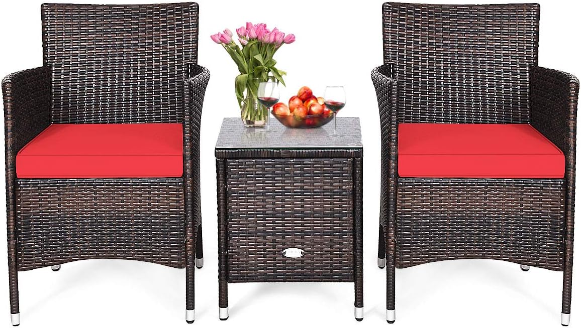 Descriptions: Enjoy the pleasure of having the outdoor coffee and conversation together under the sunshine. Contemporary elegant appearance matches the ergonomic design to blend into your unique home decor. The wicker furniture set with tempered glass table features the high-quality all weather wicker and exquisite weaving technique in order to stay beautiful after years of use and aims to bring you a premium satisfaction of relaxation and romantic, when you are entertaining guests or simply enjoy yourself under the wonderful scene. Note: Comes with assemble instruction manual. Please firstly install all the bolts, but do not tighten, then make sure all parts are correctly assembled and table sofas are not uneven, then tighten the screws. Feature: 3 piece rattan furniture set, includes 2 rattan chair and a coffee table Rattan chair with comfortable cushions, adds elegance and practicality Ergonomic armrest and the cradle-shape seat, provides a relaxing zone A coffee table with tempered glass, more stable and easy to clean Premium all weather wicker with exquisite weaving technique, sturdy and durable Breathable and detachable cushions with zipper design, pretty easy-to-clean Specification: Material: PE Rattan+ Steel frame Weight Capacity of Chair: 355 lbs Weight Capacity of Coffee Table: 110 lbs Net Weight of Chair: 14 lbs Net Weight of Coffee Table: 12 lbs Chair: 23" x 23" x 32.5" (LX WX H) Coffee Table: 16"x16"x19" (LX WX H) Package Include: 1x Coffee Table with Tempered Glass Top 2x Rattan Chairs 2x Seat Cushions 1 x instruction