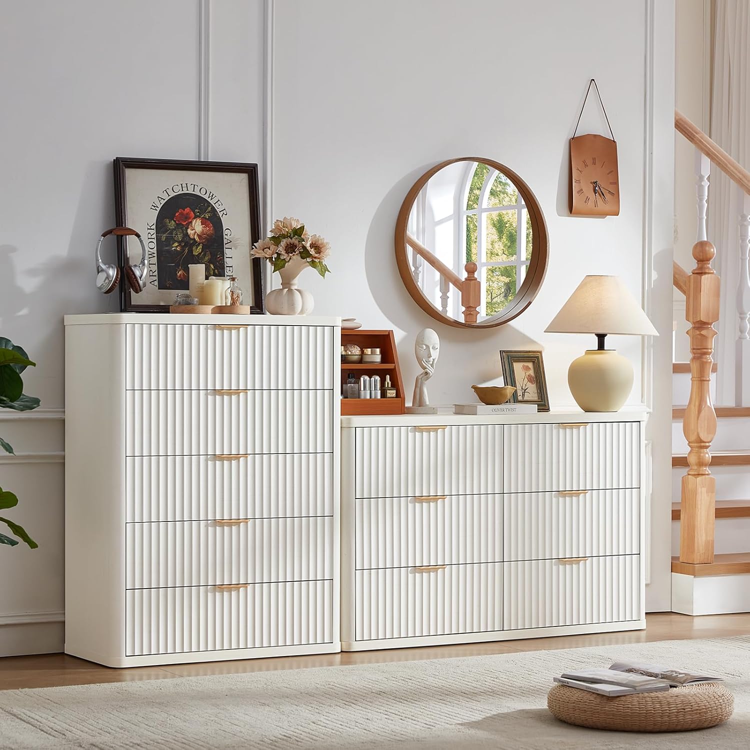 • Premium Fluted Farmhouse Design: Crafted from distressed wood and vintage metal knobs, this rustic dresser brings pure farmhouse charm to any space. Fluted wavy drawers fronts and metal knobs create a warm focal point, while the natural woodgrain finish complements modern, rustic, or shabby-chic décor styles