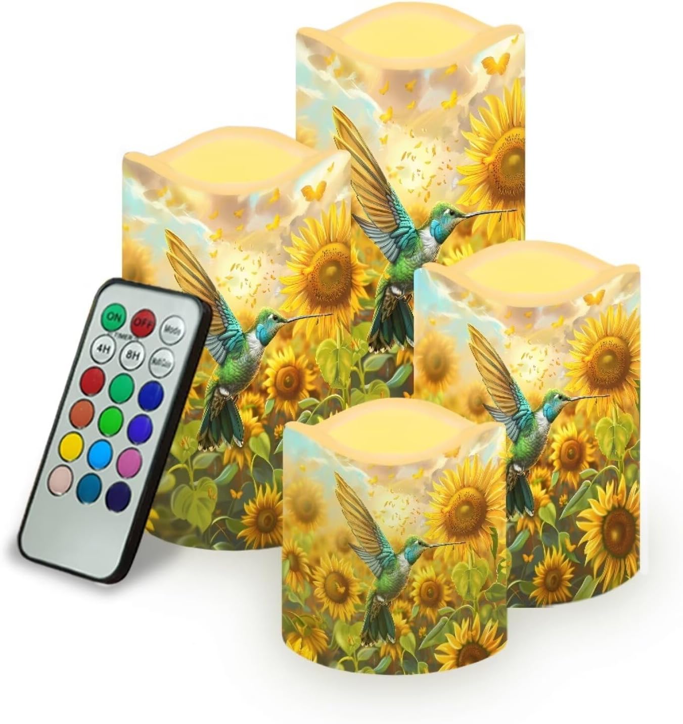 Flameless Candles Set of 4 (Remote Control Version) LED Candle*4+Remote Control*1.Remote control switch, 12-color light, flashing/constant light can be selected. Timing function can be set to use the duration of 4/8H.The flameless candles are safe to use around children and pets, won’t melt, unscented, no smoke, no fire. They can be widely applied to church, wedding, anniversaries, ceremonies, dinner, birthday and some special occasions. The electric candle set is also a great festival gift for New Year, Mothers Day, Valentines Day, Thanks Giving Day, Halloween and Christmas